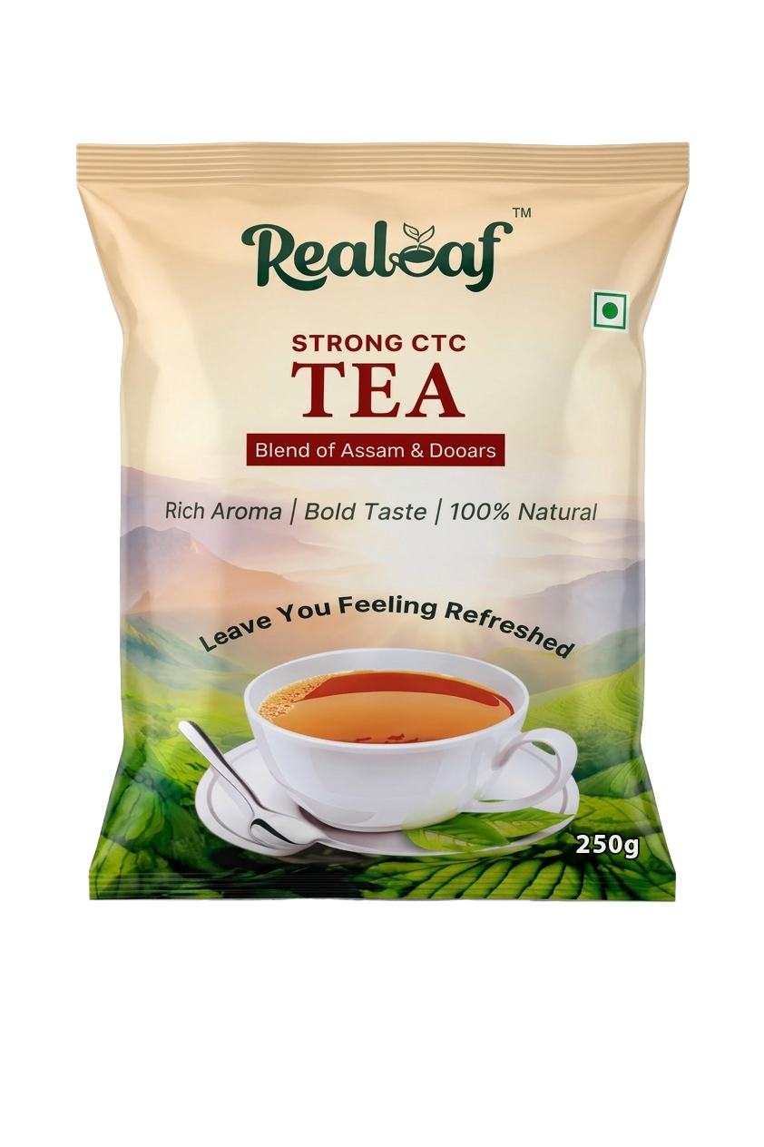 Realeaf is a premium CTC tea blend crafted for tea lovers who appreciate purity, strength, and natural richness in every cup. Sourced from the finest tea gardens of Assam and Dooars, our leaves are handpicked at peak freshness and processed with care to preserve their bold flavour, natural aroma, and authentic strength.
